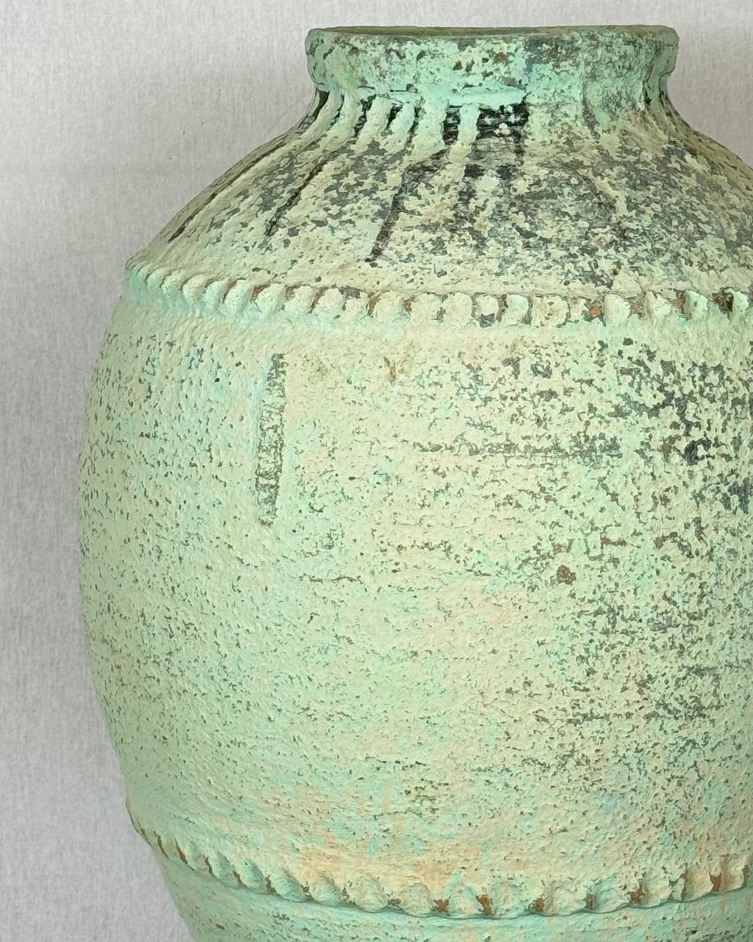 This rustic pot from Anatolia, Turkey, exudes history and charm. Originally used to store olive oil, honey, water, or wine, it is made from terracotta clay and has developed a rich, aged patina over time. Some pieces can have subtle oil stains, adding to their unique character. Hand-thrown and one-of-a-kind, each pot makes a striking decorative statement for the home or garden.