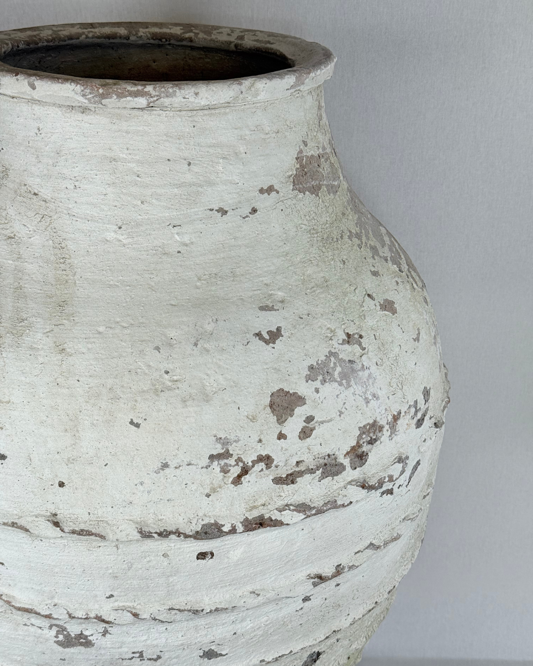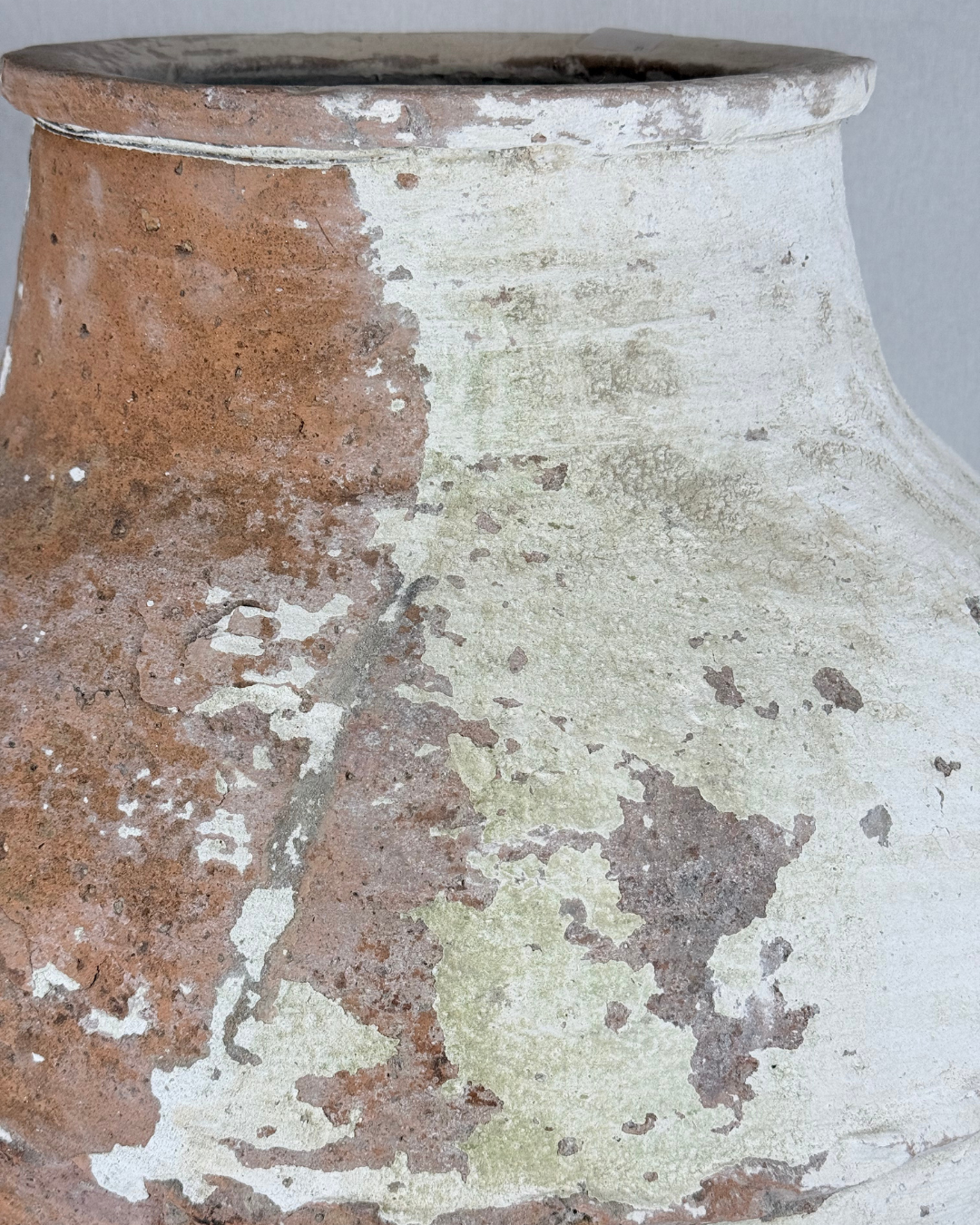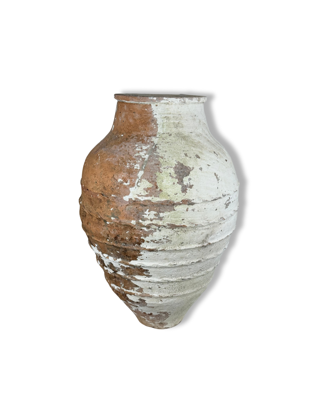 This rustic pot from Anatolia, Turkey, exudes history and charm. Originally used to store olive oil, honey, water, or wine, it is made from terracotta clay and has developed a rich, aged patina over time. Some pieces can have subtle oil stains, adding to their unique character. Hand-thrown and one-of-a-kind, each pot makes a striking decorative statement for the home or garden.