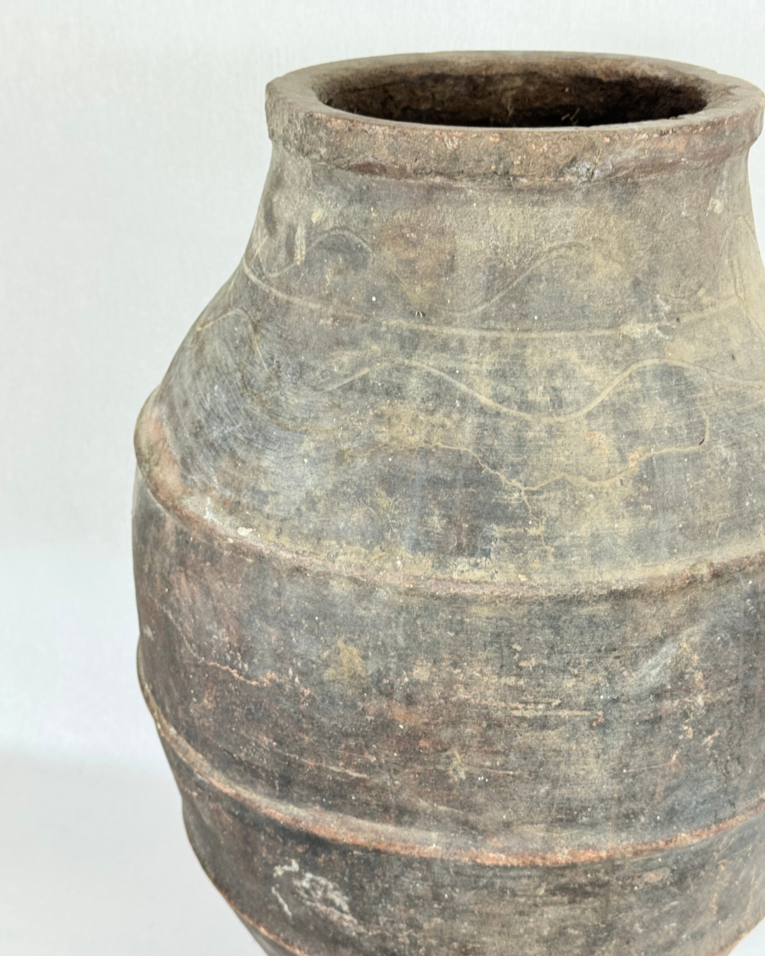 This rustic pot from Anatolia, Turkey, exudes history and charm. Originally used to store olive oil, honey, water, or wine, it is made from terracotta clay and has developed a rich, aged patina over time. Some pieces can have subtle oil stains, adding to their unique character. Hand-thrown and one-of-a-kind, each pot makes a striking decorative statement for the home or garden.